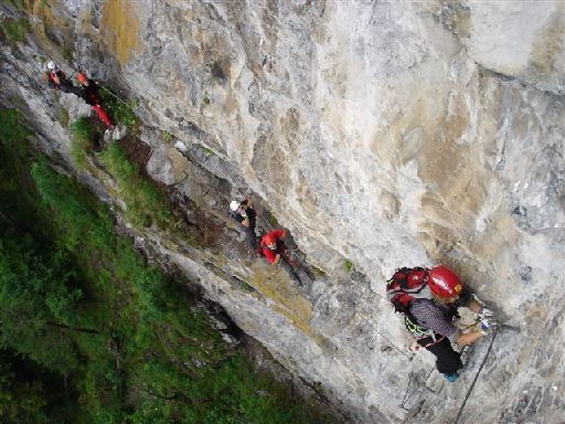 Letzten Endes entscheiden wir uns auch für den Einstieg, zumindest bis zum Notausstieg wollen wir klettern. Eine Klettersteigroute, die sich als besonders gut und schön herausstellt.Die Ausstiegswand lassen wir dann außen vor wegen der Nässe! Keiner will ein zu großes Risiko eingehen. Wir entscheiden uns alle für den Abstieg. Zumindest in Augenschein hatten wir die gigantische Ausstiegswand genommen. Die "Rechnung" steht noch aus - wir freuen uns drauf !!!